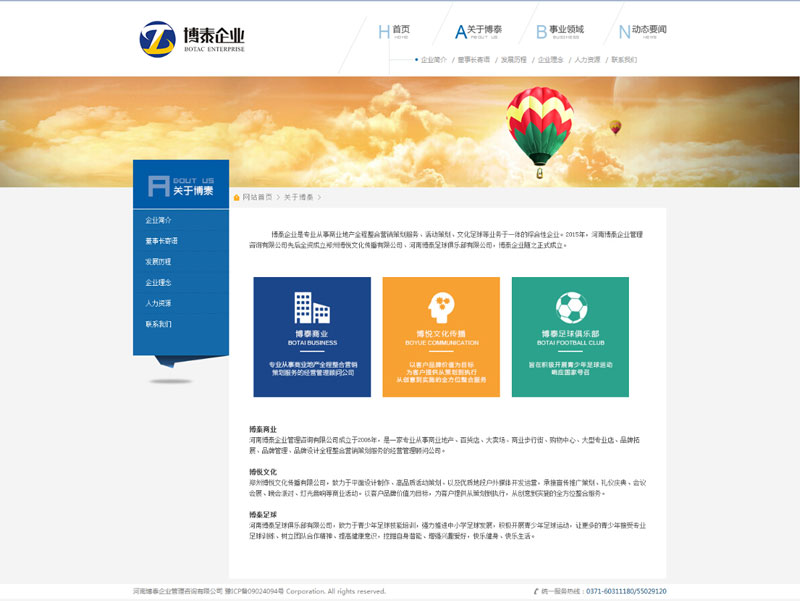 博泰企業是專業從事商業地產全程整合營銷策劃服務、活動策劃、文化足球等業務于一體的綜合性企業。2015年,河南博泰企業管理咨詢有限公司先后全資成立鄭州博悅文化傳播有限公司、河南