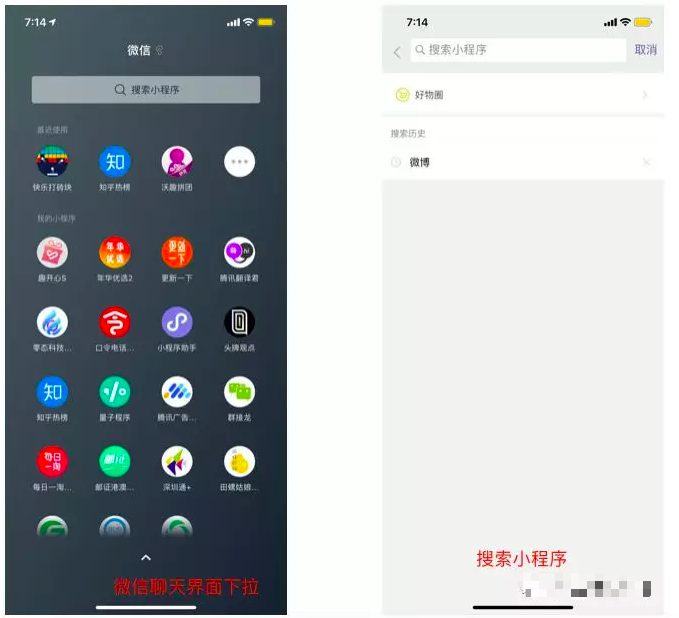 小程序的渠道:在微信中可以通過搜索、掃一掃和長按識別等方法獲得,不會占用手機內(nèi)存,也不需要安裝,通過微信界面下拉即可找到,分為所有用過的小程序和常用小程序。