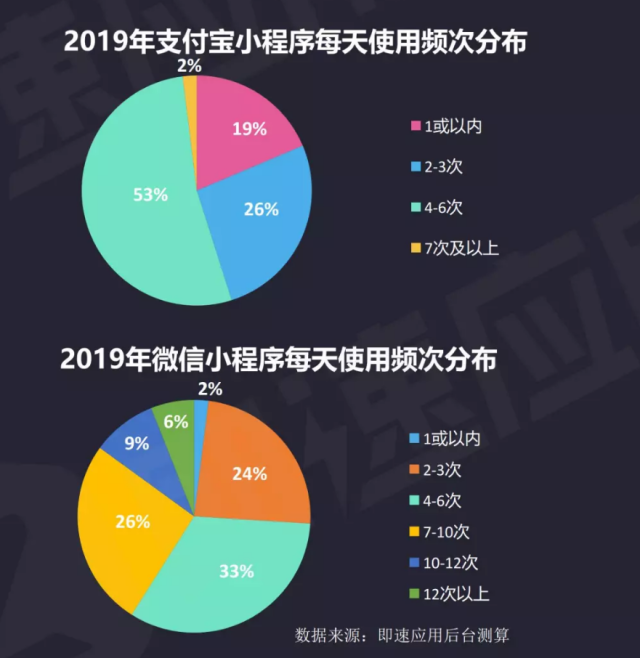 即使支付寶小程序在過去一年增長迅速,用戶基數帶來的巨大差距仍舊反應在月活、日活各項數據上。這一方面意味著不同屬性平臺用戶人群廣泛性的差異,比如男女老幼都會用微信。另一方面,則是應用場景豐富度的差異。