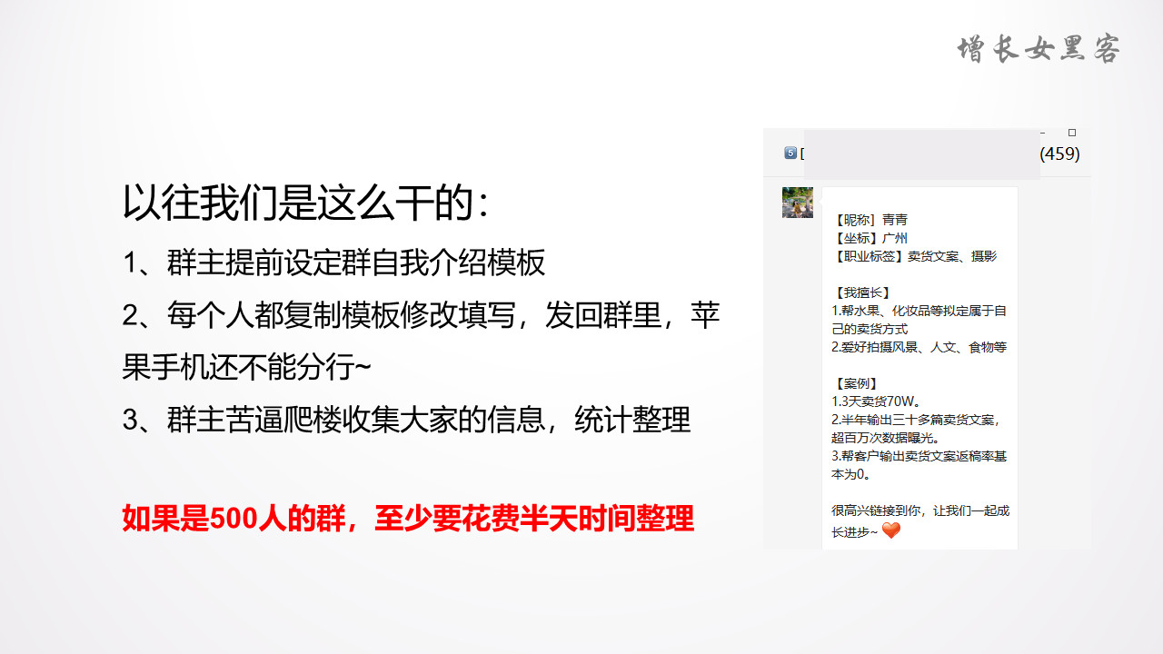 這樣一來,群勾搭小程序就可以快速地把群里大家填寫過的自我介紹名片整理成集,群主不用自己去做整理了,就是這么一個小場景。