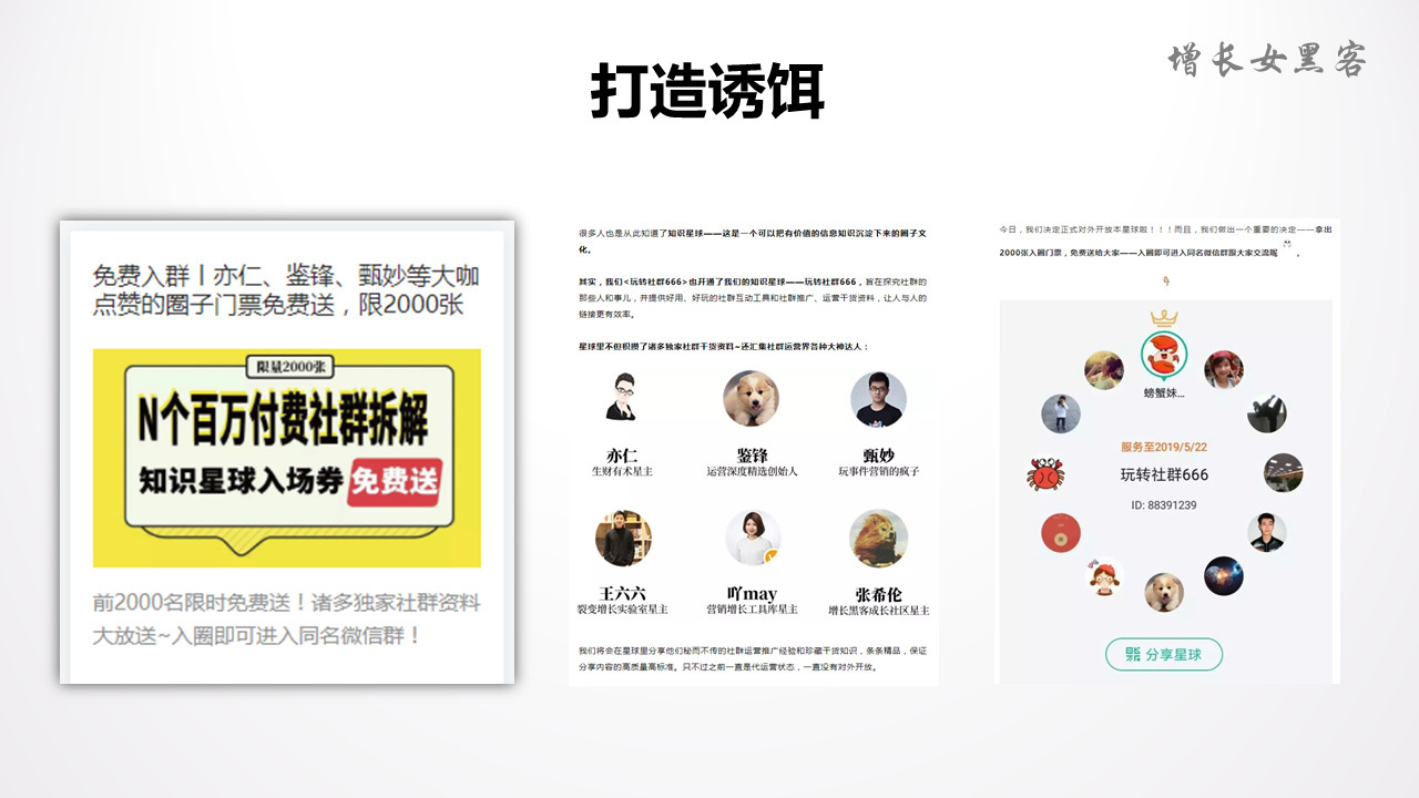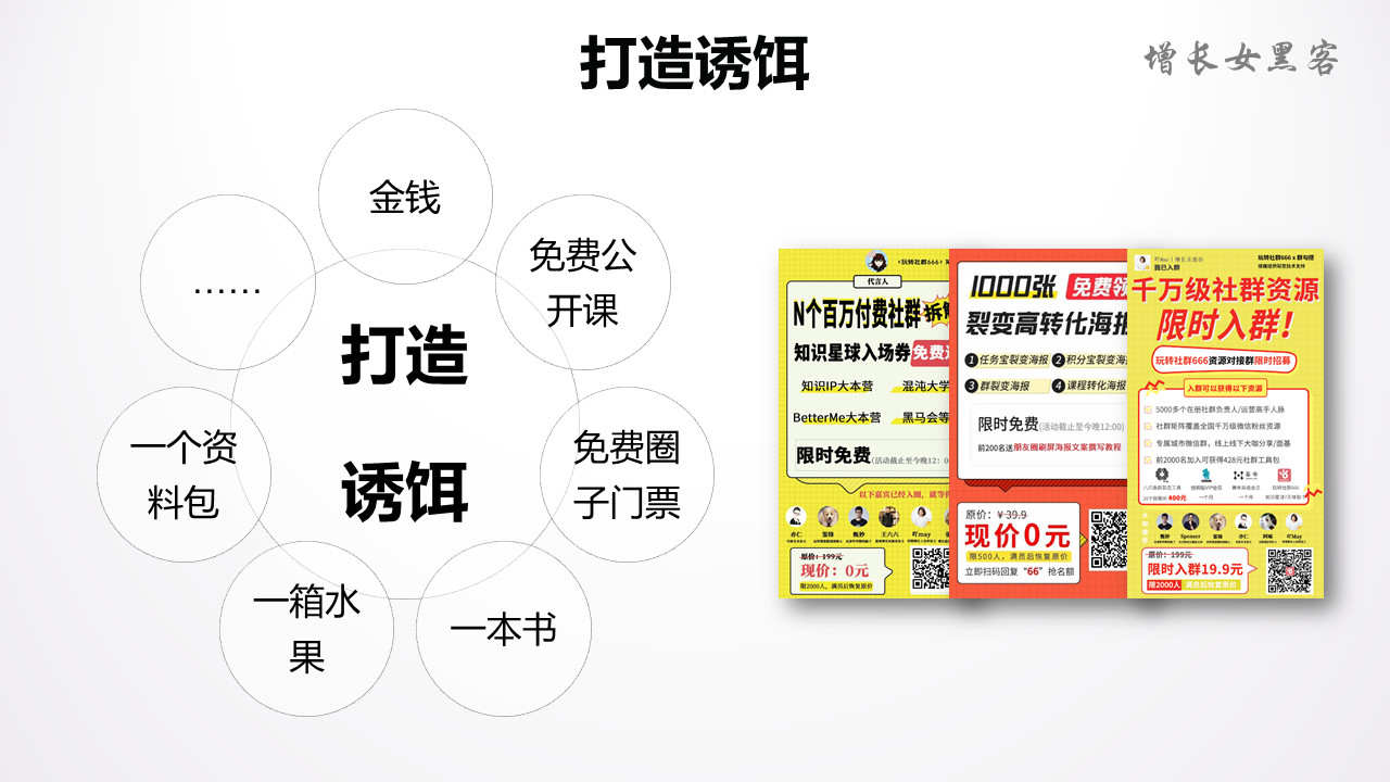 我把整個過程再給大家拆解一下,首先是打造活動誘餌,在做裂變的過程當中打造誘餌是非常非常重要的,能不能讓用戶真的感知到活動價值,讓用戶一看就覺得這就是我想要的,就愿意加入甚至付費加入。