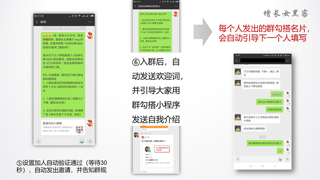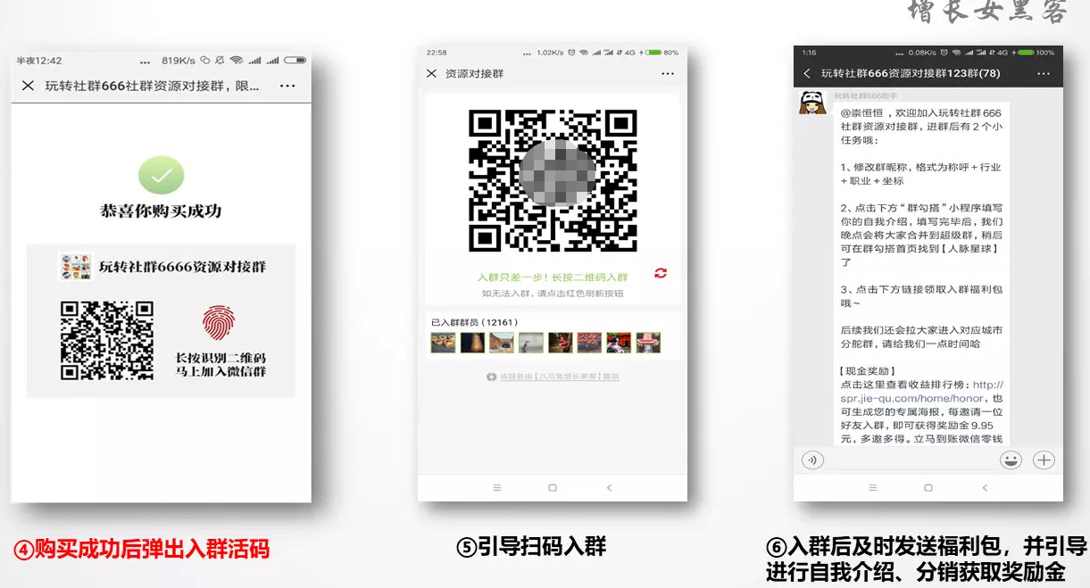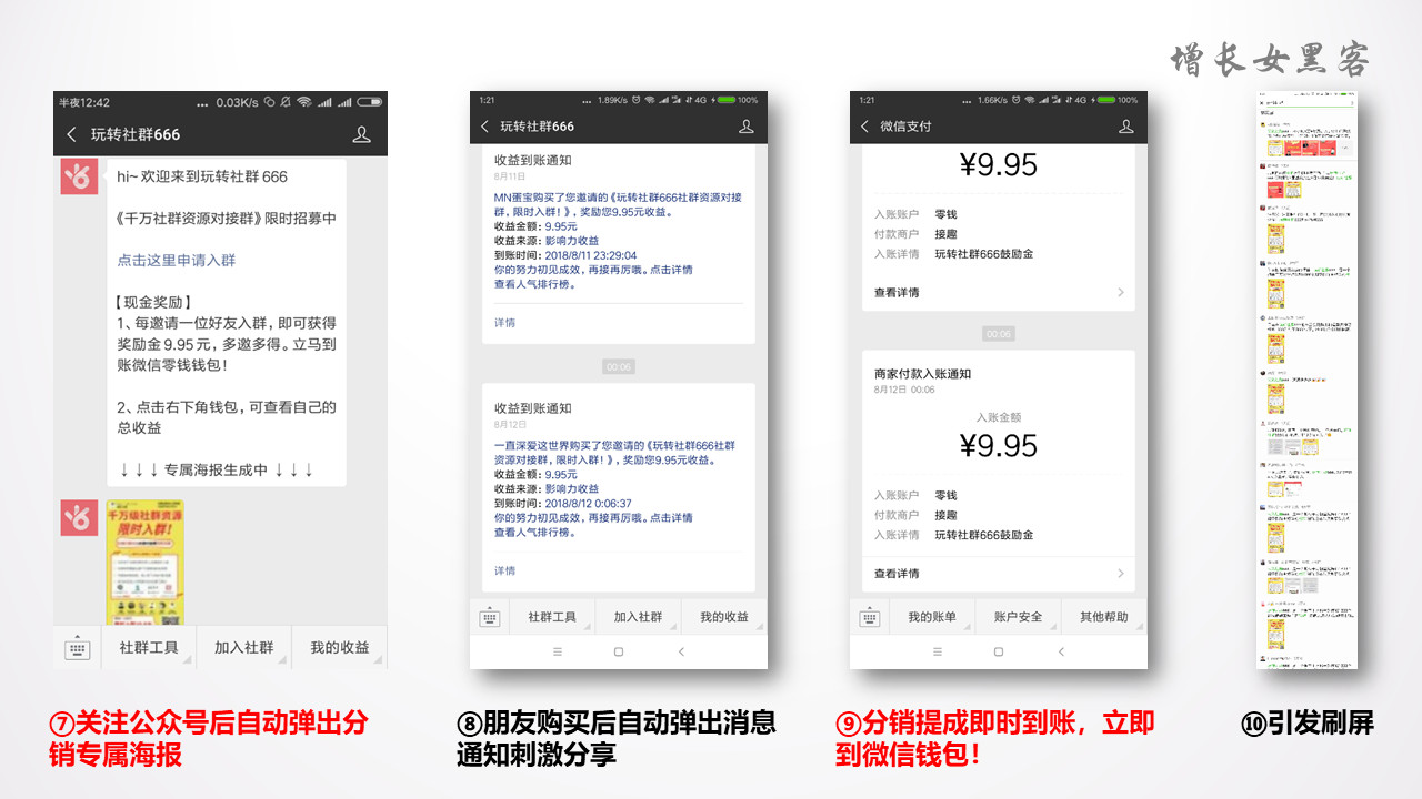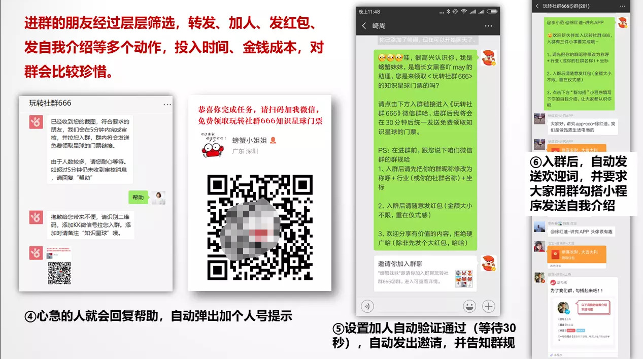 而且用戶從前面的轉發、發截圖,到進群之后發紅包、發自我介紹資料,通過層層篩選,他投入了很多的動作和時間,包括金錢的成本,所以他對這個群就會非常珍惜,也不會進去馬上發廣告。
