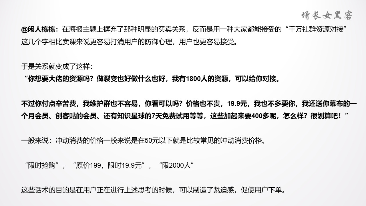 這本書是目前社群營銷非常實戰落地的書籍了,京東售價是69,所以對于很多群主來說,這本書對他誘惑力還是比較大的。進群的人由于看到知識星球里的內容,已經感受到我這個社群的價值了,他對我們認可度很不錯了,所以他們會很愿意去幫我們做推廣。