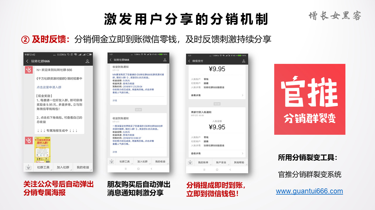 于是我們專門為此開發了一套系統——官推分銷群裂變系統,讓用戶購買之后,分銷收益可以馬上到微信零錢錢包,這是非常刺激的,而且他一分享朋友圈,一會到賬一個,一會到賬一個,就會刺激他不斷去分享。