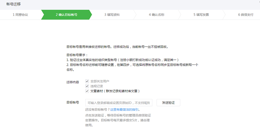 2)目標(biāo)賬戶B必須是驗(yàn)證過(guò)主體信息【小額打款驗(yàn)證或認(rèn)證成功(包括資質(zhì)審核成功)】的組織類(lèi)訂閱號(hào)或服務(wù)號(hào)。