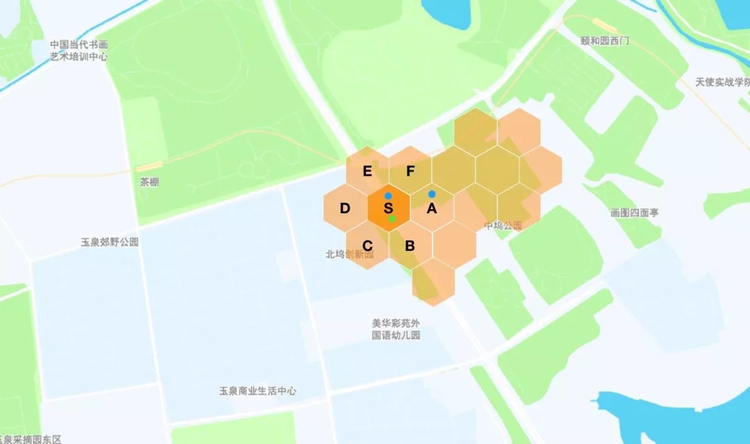 例如,圖中將地圖劃分成了若干蜂窩狀區域,并對區域進行了編號:S、A、B、C、D、E、F,綠色點為乘客呼叫位置,藍色點為可派單范圍司機。