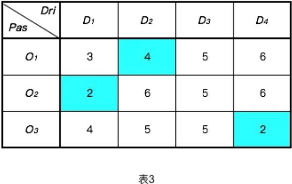 如下圖3所示,可能得到另外一種組合匹配關系:O1-D2,O2-D1,O3-D4,該種組合決策下,平均耗時約2.7分鐘,總共耗時8分鐘。