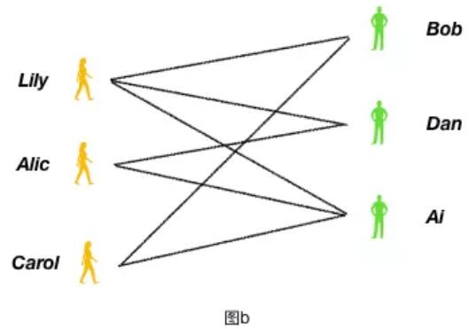 下圖 b 是著名的男女配對問題:左側3名女孩,右側3名男孩,連線代表他們互相喜歡,如果將互相喜歡的進行兩兩配對,最多可以配出多少對?
