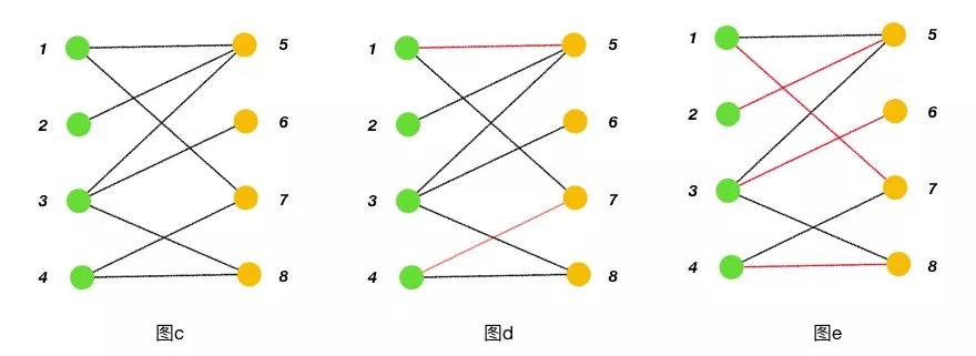 完美匹配:如果一個圖的某個匹配中,所有的頂點都是匹配點,那么它就是一個完美匹配。圖 e 是一個完美匹配。