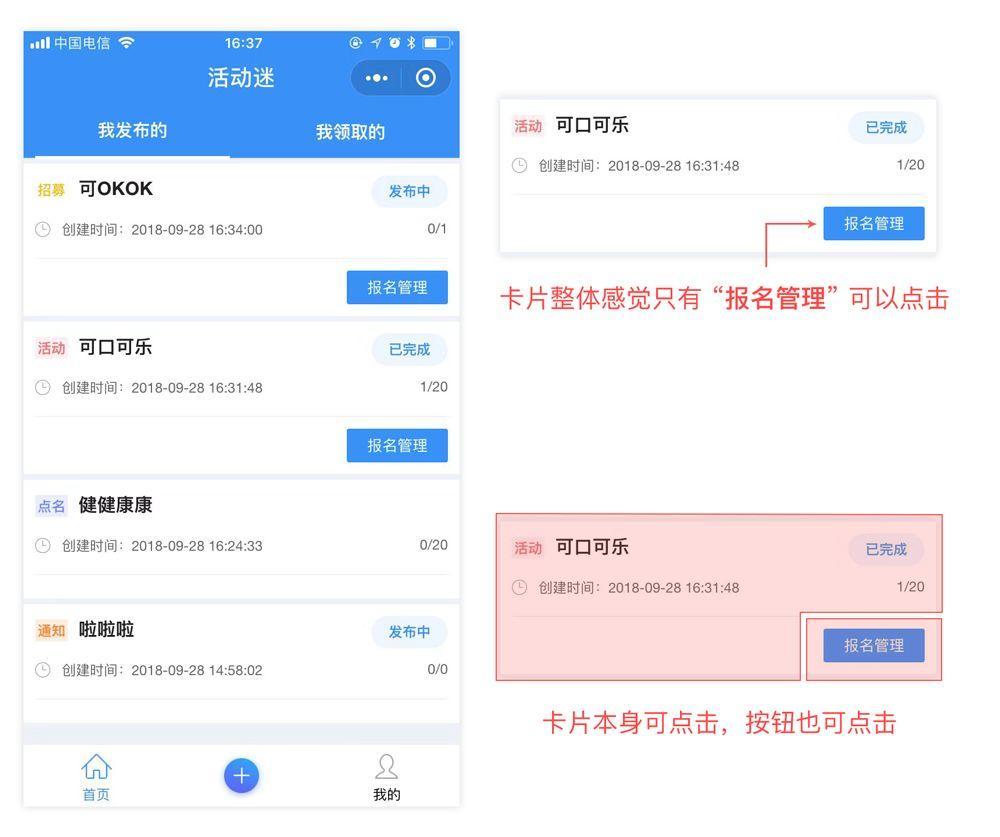 “報名管理”的按鈕設計會給人一種,整個卡片只有最突出的藍色按鈕可以點擊的錯覺,實際上整個卡片也是一個可點擊項。
