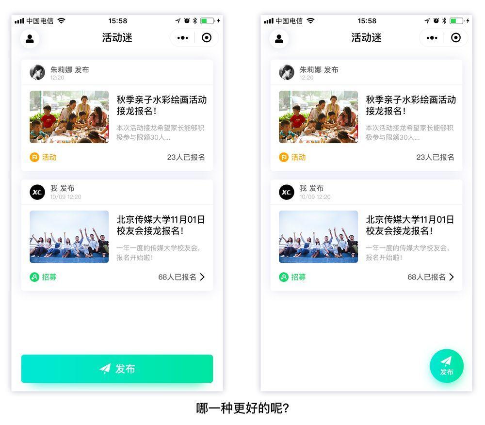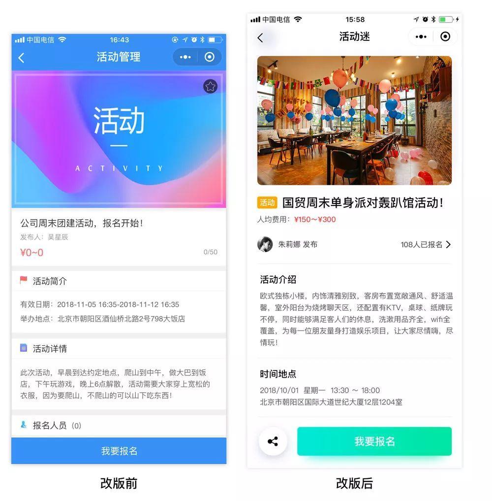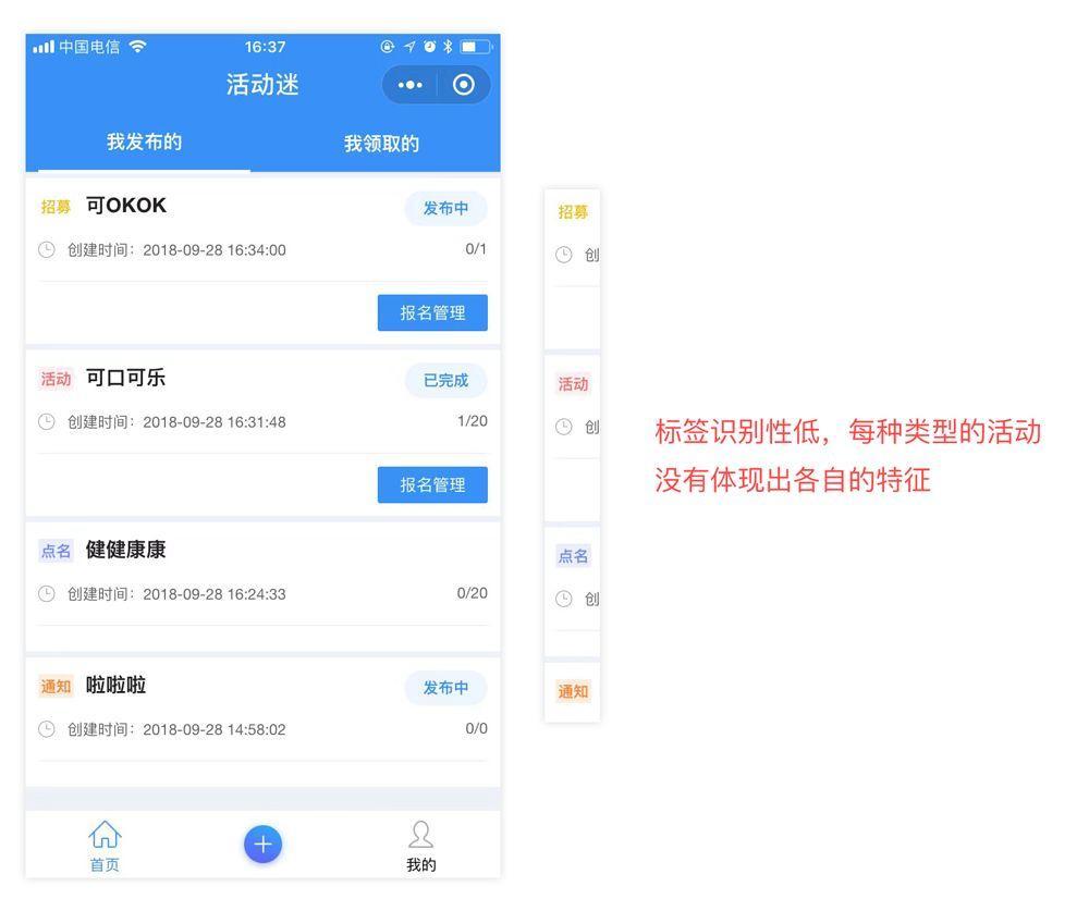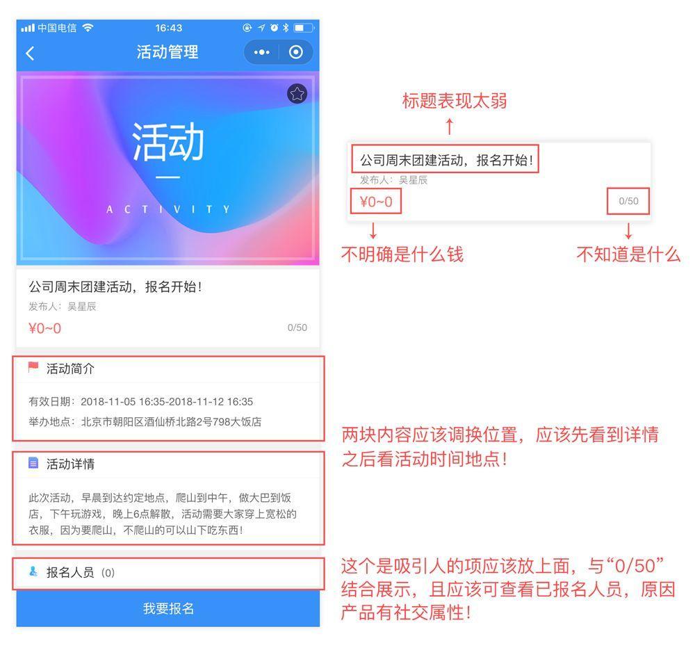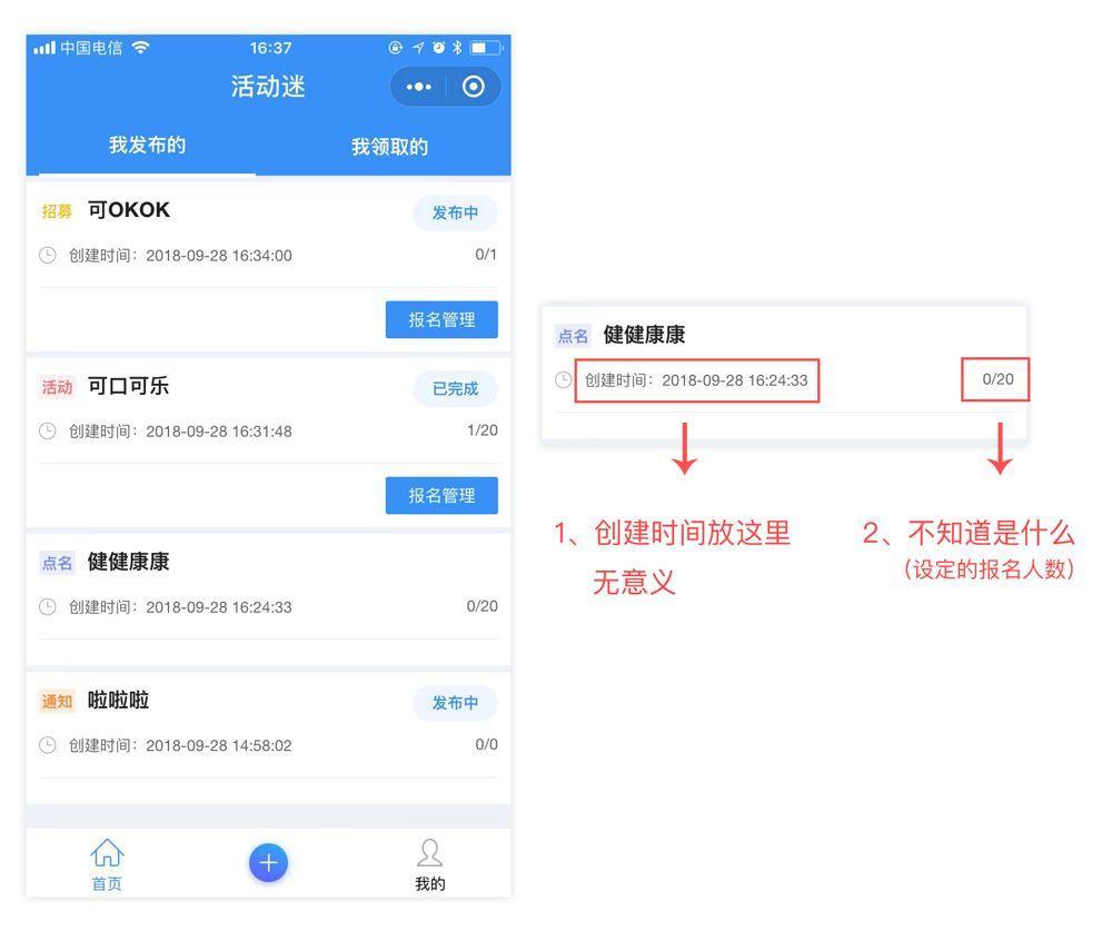 產品上的問題“創建時間”放這里沒有任何意義,因為并不是用戶關注的點,“0/20”讓用戶一頭霧水,不知道是什么意思。(實際上是限定了活動的報名人數,可以看到報名人數的一個進度)