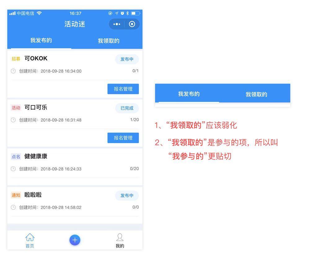 “我領取的”應該相對于“我發布的”弱化一些,其次“我領取的”并不符合功能標題,“我參與的”更為貼切。