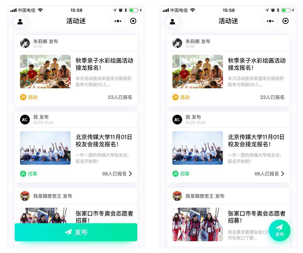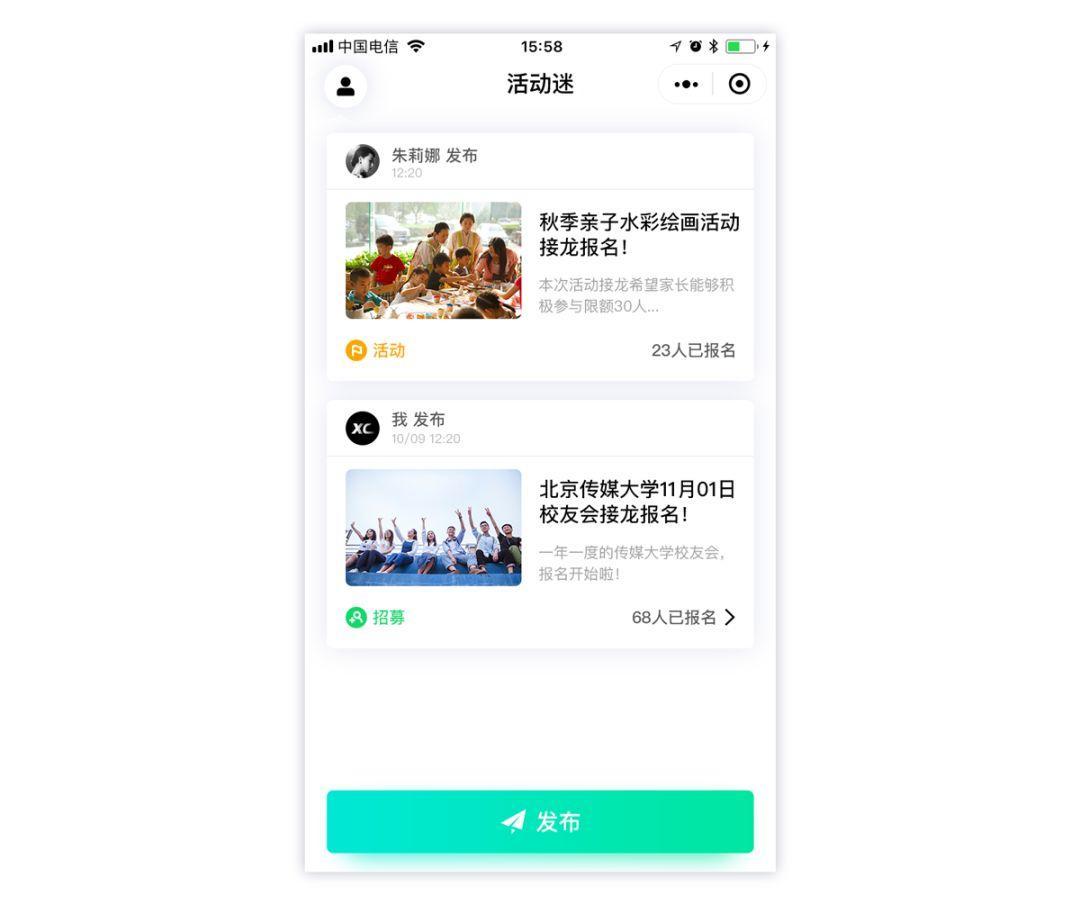 產品的核心功能“活動、招募、點名、通知”都是有時效性的,用完就很少再關注,用戶也很少同時用到好幾個功能。所以,首頁展示的都是用戶正在進行中的一個或幾個活動項,所以去掉tab選項卡更為直接!